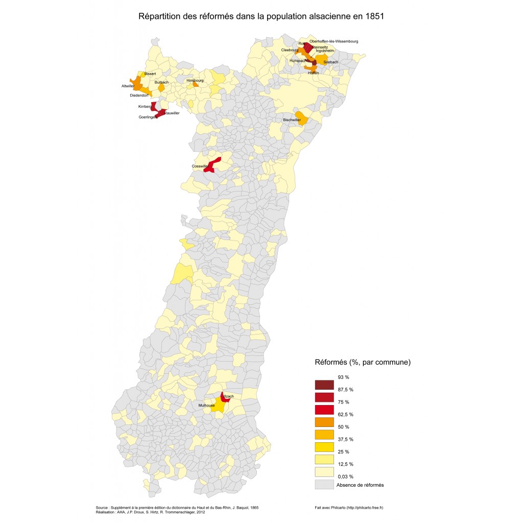| Diese Karte zitieren | Nicolas Stoskopf, « La répartition religieuse en Alsace en 1851 », in Atlas historique d'Alsace, www.atlas.historique.alsace.uha.fr, Université de Haute Alsace, |